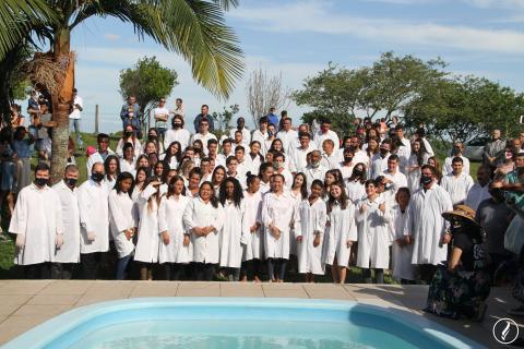 Nas águas o presbítero Cristiano Medeiros, evangelista Valdenir Berto e pastor Hebrom Mussini deram início ao batismo. Após todos serem batizados foi realizada uma oração em agradecimento a Deus.