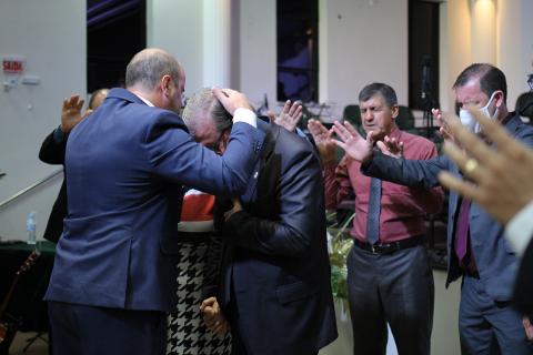 Pastor Davi da Silva, 2º vice-presidente realizou uma oração abençoando pastor Valdeni e sua esposa juntamente com os obreiros.