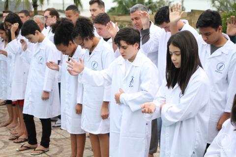 Nas águas o pastor Giovane Tavares e presbítero Fernando Fleck deram início ao batismo. Após todos serem batizados foi realizada uma oração em agradecimento a Deus.