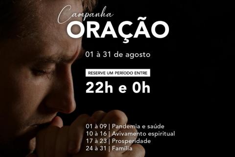 No mês de agosto a AD Içara está com uma nova campanha de oração. Todos os dias entre as 22h e 0h você deve reservar um período de oração no seu lar. A cada semana um tema de intercessão será proposto. Os primeiros dias de oração será em favor da pandemia e da saúde.