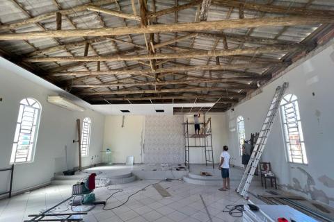 A reforma do templo do bairro Esplanada avança a cada dia. Recentemente foi iniciada a colocação da forração interna do templo. Anteriormente foi realizada a remoção de todo telhado, troca de armações, e também a instalação de nova fiação elétrica. Veja as fotos.